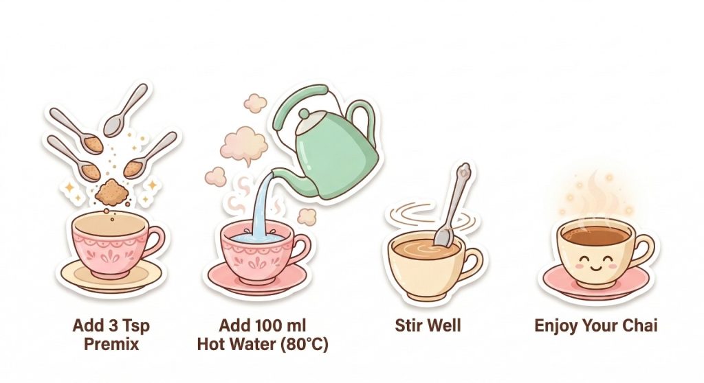Add 2 teaspoons of tea premix into a clean cup. The premix is carefully blended to deliver a balanced tea flavor and smooth taste in every cup.