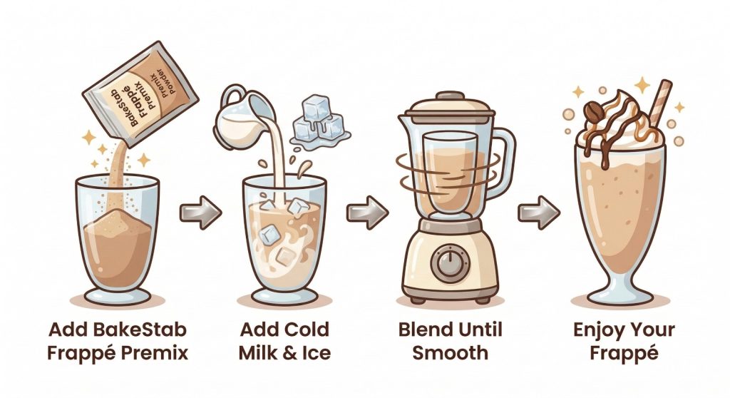 Preparing a delicious, super creamy Frappe using BakeStab Frappe Mix is quick and effortless. Follow these easy steps to enjoy a rich, creamy frappe anytime: